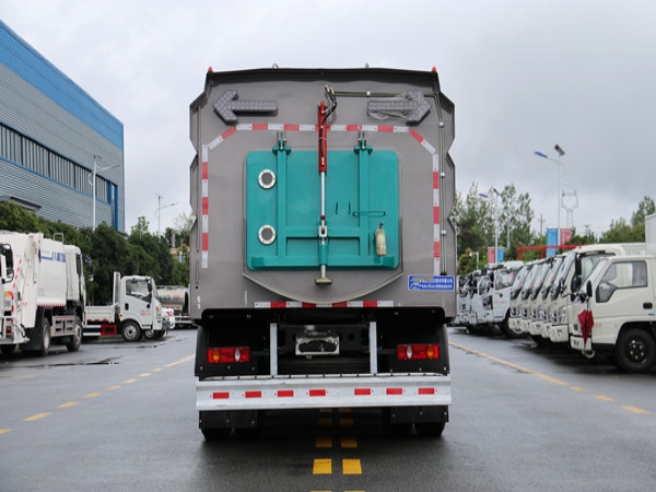 清水箱充分利用了車載空間,容積大,可達 7.5m3。垃圾箱采用單層 304 不銹鋼結構,傾翻卸料,帶高壓自潔裝置。自潔裝置可在垃圾箱卸料時幫助卸料,清洗垃圾箱內部。