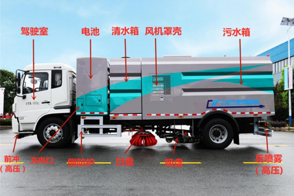 3、洗掃車采用東風純電動二類汽車底盤改裝,加裝風機、高壓水泵、清水箱、垃圾箱、左右立掃、帶噴水桿的寬吸嘴、掃盤降塵系統、液壓系統、專用裝置電控系統和副車架等改裝而成。